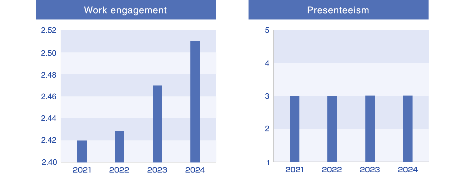 - *1 For work engagement, we use a common measurement method of averaging the value of “pride in work” and “vitality” in the The New Brief Job Stress Questionnaire (the most favorable value is 4.0 and the least is 1.0). Presenteeism is a condition in which employees are at work but their performance is reduced due to illness or injury. For presenteeism, we use the five-point rating index by Humanage, Inc., in which being rated 3 is considered to be at the national average level (the most favorable rating is 5 and the least is 1).