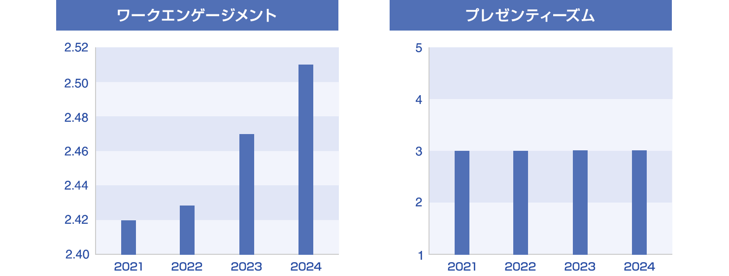 - ※1 ワークエンゲージメントは新職業性ストレス簡易調査票の「仕事に対する誇り」と「活力」に関する項目の平均値(最も良好な値が4.0、最小値は1.0)とする一般的な測定方法を採用しています。プレゼンティーズムとは、「出勤はしていても病気や怪我などによりパフォーマンスが低下している状態」のことで、従業員アンケートにて測定しています。当社グループでは株式会社ヒューマネージのプレゼンティーズム指標を採用しており、5段階評価(最も良好な値が5、最少値は1)のうち3が全国平均レベルとされています。