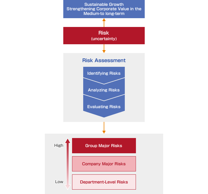 Risks are assigned managers according to the risk levels determined through risk assessments. Risks that may affect the entire Group are designated as Major Risks and are managed by the Risk Management Committee. Risks that have higher priority within each Group company are designated as Company Major Risks, and are overseen by the Board of Directors of each respective company. For each risk, the responsible risk owner (the department in charge) conducts regular monitoring and review of the status of risk responses.