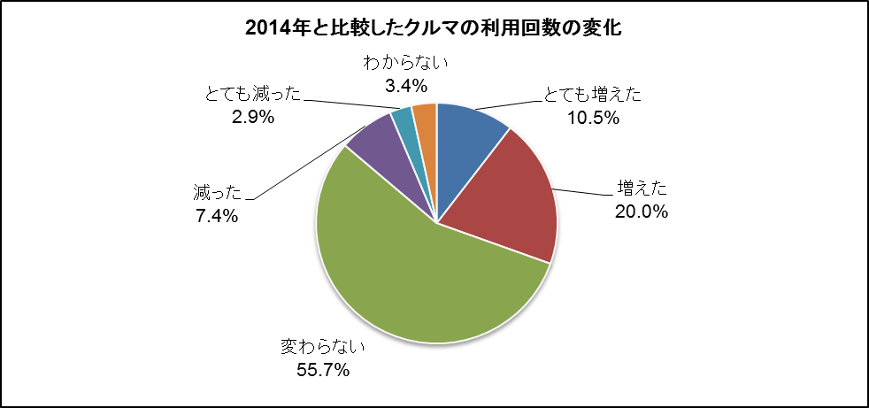 前年(2014年)と比較し、クルマの利用回数が「とても増えた」「増えた」と答えた方の割合は30%だったのに対し、利用回数が「とても減った」「減った」と答えた方は10%で、利用回数が増えた方が多くなっています。