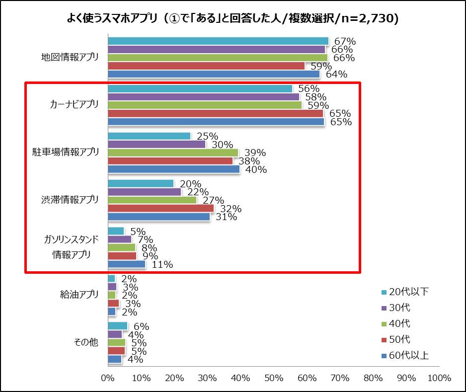 年代別でみると、「地図情報アプリ」の利用状況には大きな差がなかったのに対して、「カーナビアプリ」「駐車場情報アプリ」「渋滞情報アプリ」「ガソリンスタン情報ドアプリ」については、20代・30代よりも40代以上のスコアが高い結果となりました。
