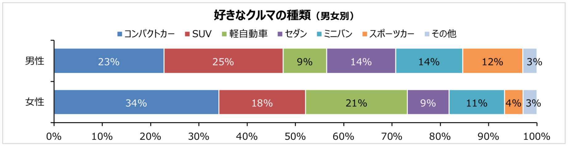 男女別で見ると、男性は「SUV」25%が最多、以降「コンパクトカー」23%、「セダン」・「ミニバン」14%と続いています。女性は「コンパクトカー」34%、「軽自動車」21%、「SUV」18%の順となり、男女で好みに違いが出ました。