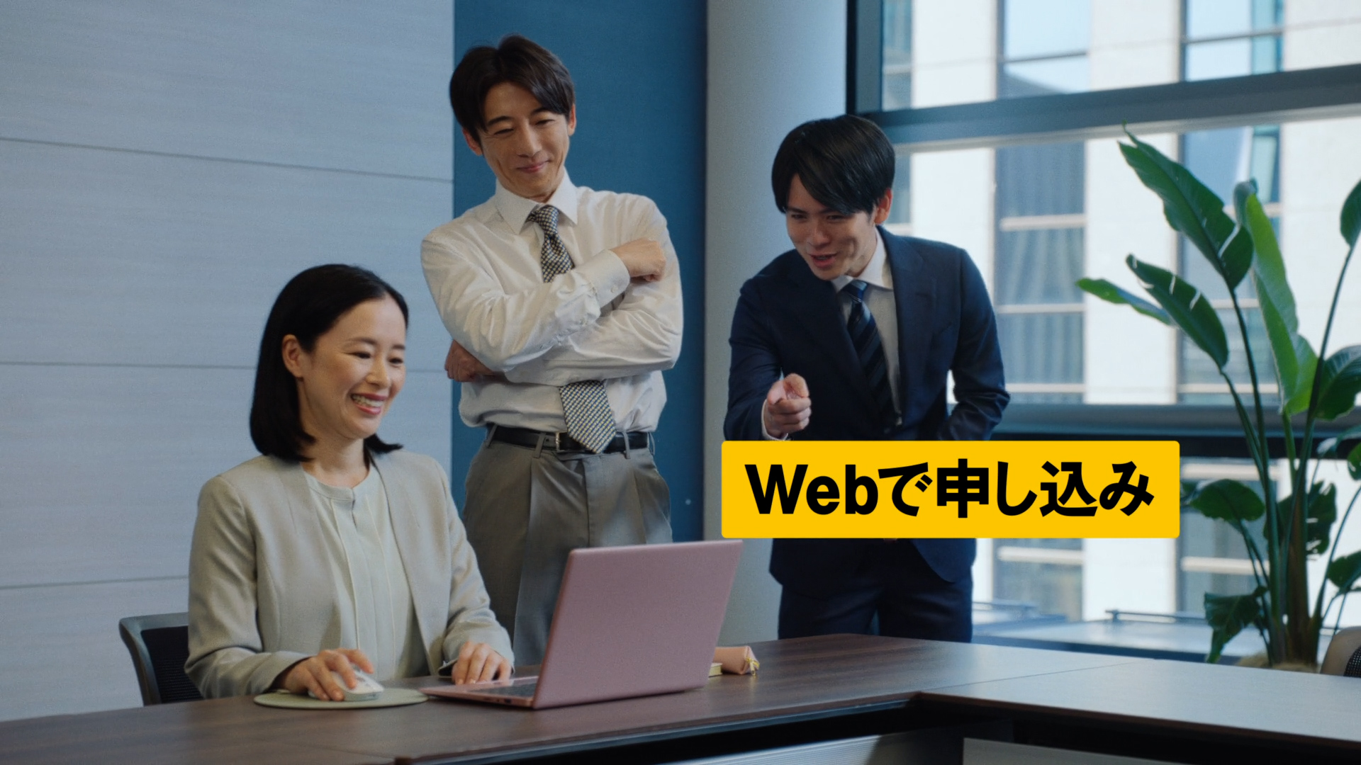 最後は、パソコンからタイムズカーの申し込みボタンを「ポチッ」とクリックする総務部長の後ろで、それを見守る高橋一生さんと後輩。申し込みの完了を見届け、拍手しながら「ポチッ」につられて「ポチポチポチポチ・・・」と喜ぶも、自身の言い間違えと、総務部長と後輩に引かれている様子に気付き「パチパチ、パチパチか。。。」と気まずい雰囲気を収めようとする様子をコミカルに演じる高橋一生さんにも注目です。