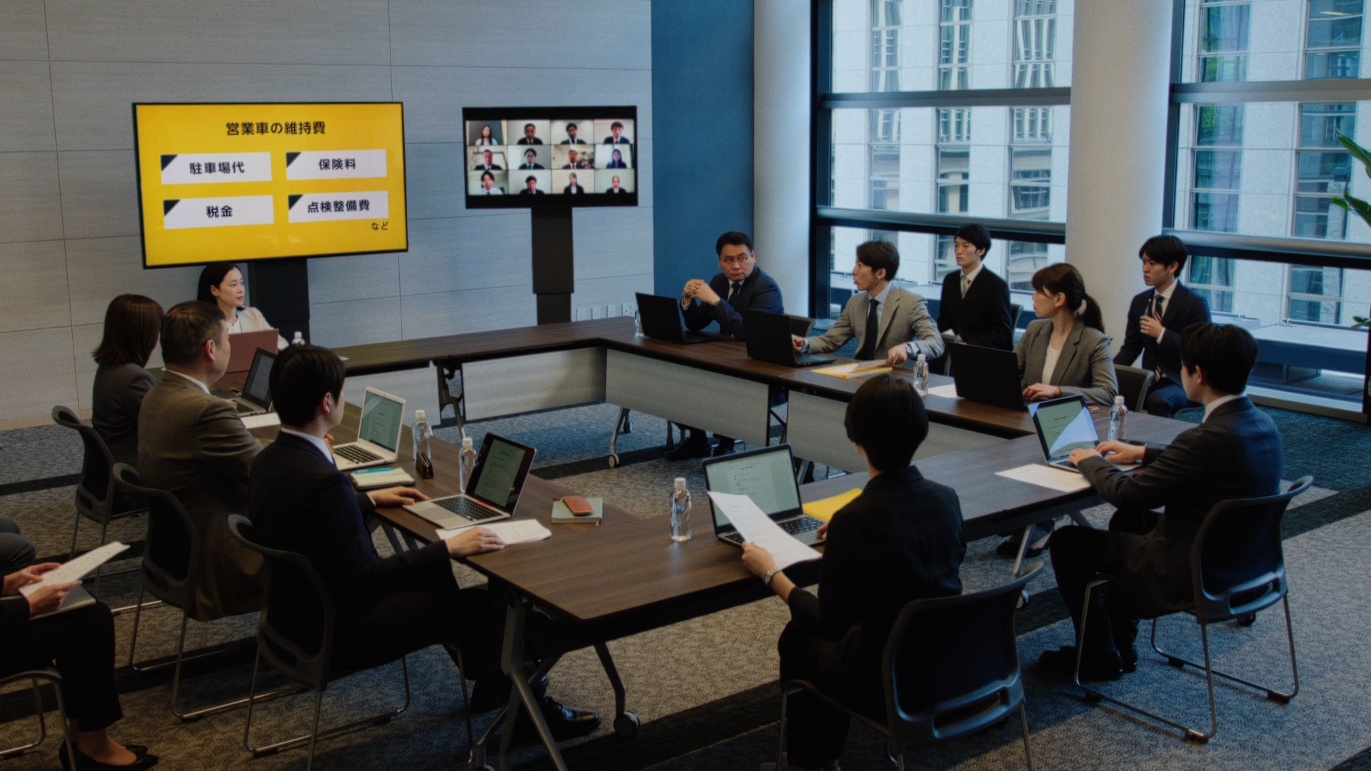 営業車を管理する総務部と高橋一生さんをはじめとする営業部との「全国営業コスト削減検討会議」が開かれている。コスト削減策の一つとして“営業車の削減”という総務部長からの提案に、「営業車を減らす!?」と驚く高橋一生さん。立て続けに、駐車場代・保険料・税金・点検整備費などの営業車にかかる維持費を上げ、「維持費が高いので」と、その理由を説明する総務部長。「でも、、、」と高橋一生さんが面食らっているその時、後輩から1枚のメモが渡される。後輩から渡されたメモを理解が追いつかないまま「タイムズのカーシェアなら全国で営業車として使えて、維持費0円です」と不安げな表情で読み上げるが、心配な高橋一生さんは「今って、そうなってんの!?」と後輩に小声で確認する。総務部長も営業部からの意外な提案に「今って、そうなってんの!?」と迫る。そこで、「はいっ!」と自信満々に答える後輩に便乗して、どこか頼りない表情に弱々しげなガッツポーズをとる高橋一生さんだった。
