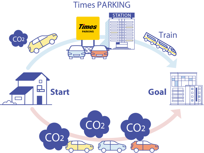 「交通ICパーク&ライド」は、駐車場と鉄道が協力してつくった交通システムで、駅の近くのタイムズパーキングにクルマをとめて電車や新幹線などの公共交通機関を利用して目的地まで移動することで、駐車料金の優待を受けられるサービスです。交通渋滞緩和による移動時間の短縮およびアイドリングによる大気汚染の抑制につながるため、「環境負荷低減型交通サービス」として提供を推進しています。